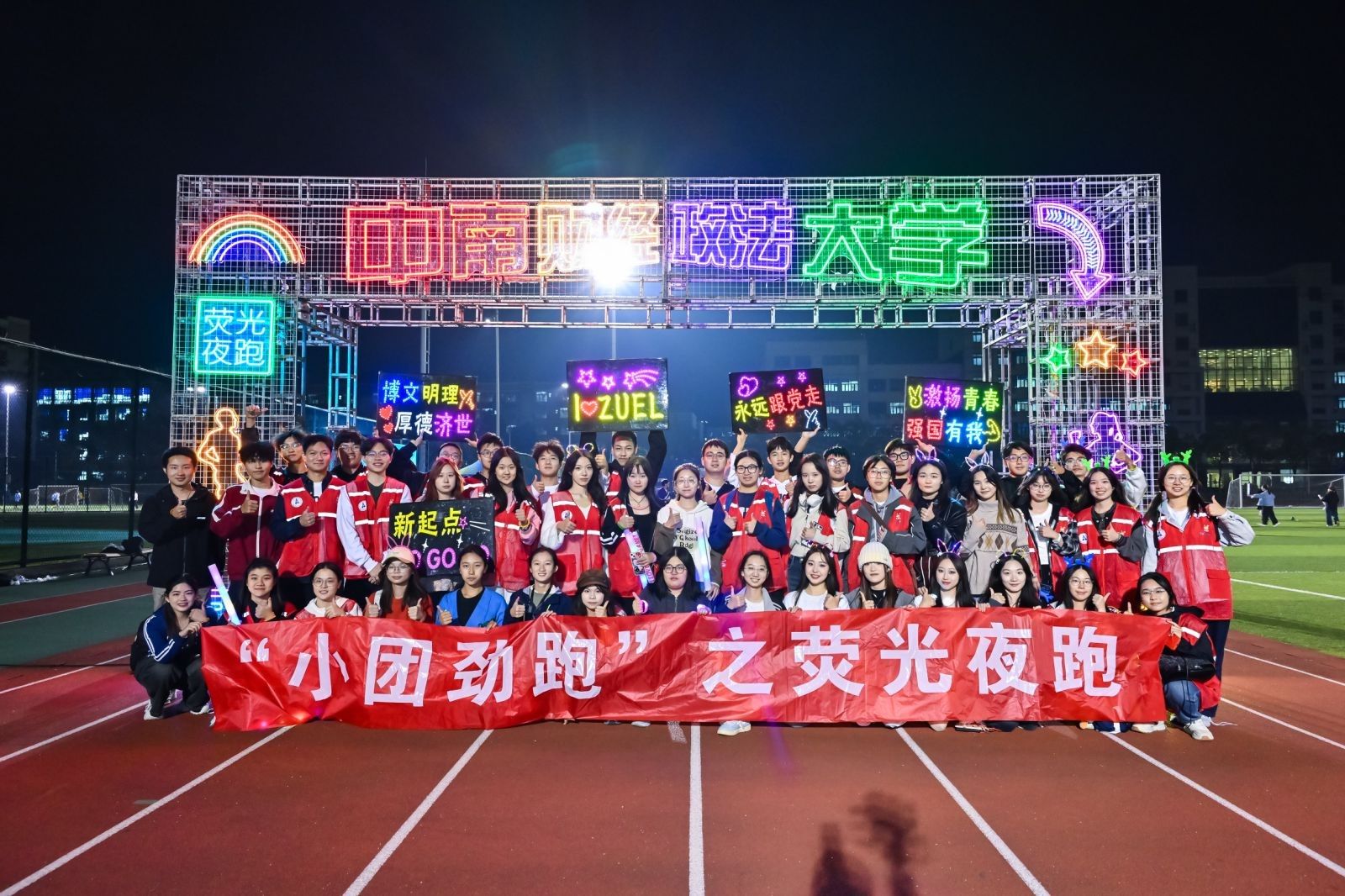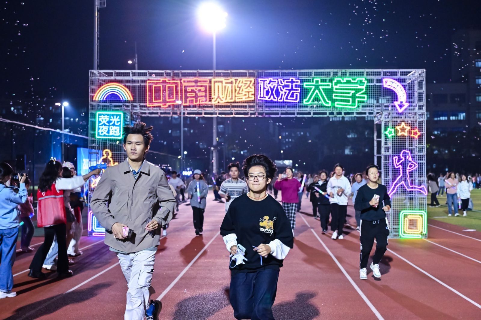 正式起跑后,来自各学院的团支部领跑队伍率先冲出起点,带领师生奔跑向前,上千名ZUELers挥动各色荧光棒,在操场上有序奔跑,用荧光点亮夜空。