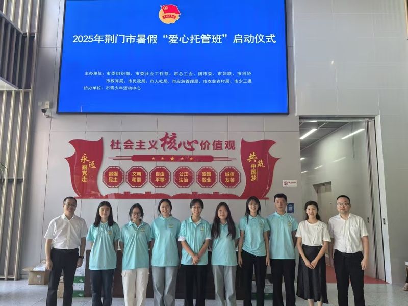 近日,荆门市暑假“爱心托管班”启动仪式在荆门市青少年活动中心举行,我校8名师生代表参会。本次活动汇聚荆门市领导、市直单位负责人、各县(市、区)团干部、高校代表及志愿者等240 余人,共同拉开暑假爱心托管服务的序幕。