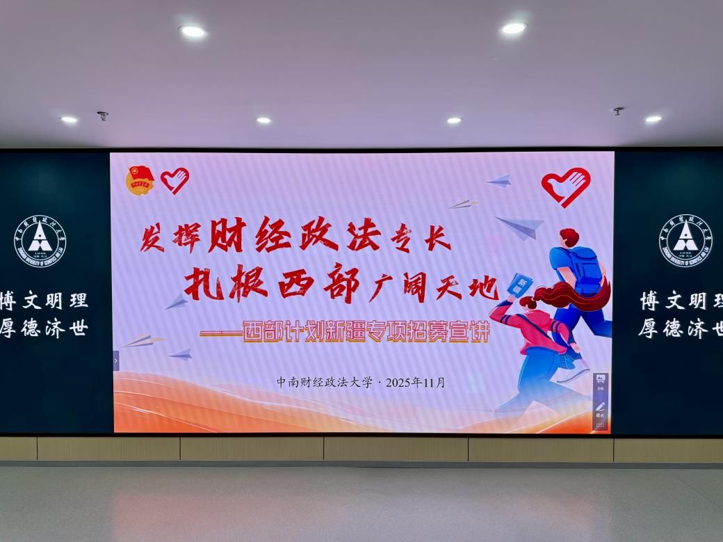 新闻网讯(学生通讯员 金飞扬 范祖瑞)11月27日下午,“报效祖国 建功西部”西部计划新疆专项招募宣讲会于中南财经政法大学南湖校区文瀚楼北区107实验室顺利开展。共青团新疆维吾尔自治区委员会大学生志愿服务西部计划办公室选派宣讲人员来校宣讲。