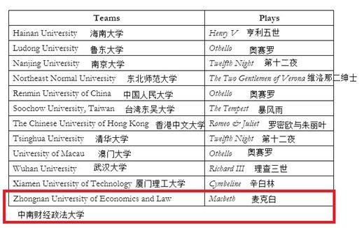 我校莎士比亚戏剧社成立于2005年,该社作为外国语学院文化建设的品牌活动,一直备受校级和院级领导、老师们的大力支持。本次莎剧社选送的剧目《麦克白》,选取巧妙,精心编排。为提高演出质量,《麦克白》导演康芸菁、主演邓嘉、刘祎、胡尚斌曾在去年12月专程赶赴北京大学参加为期三天的莎剧表演大师班培训,接受专业的戏剧表演训练,并积极从其他参赛队伍的表演中吸取了表演、发音和编剧等方面的经验。台前幕后的所有演职人员为《麦克白》的成功演入围做出了巨大努力。整出剧目于今年一月中旬在本校艺体中心音乐厅完成现场录制,期间得到了来自外国语学院领导老师以及校学生会文艺部的设备、技术的支持,最终以出类拔萃的表演获得评委青睐,受邀于5月底赴香港中文大学参加决赛。