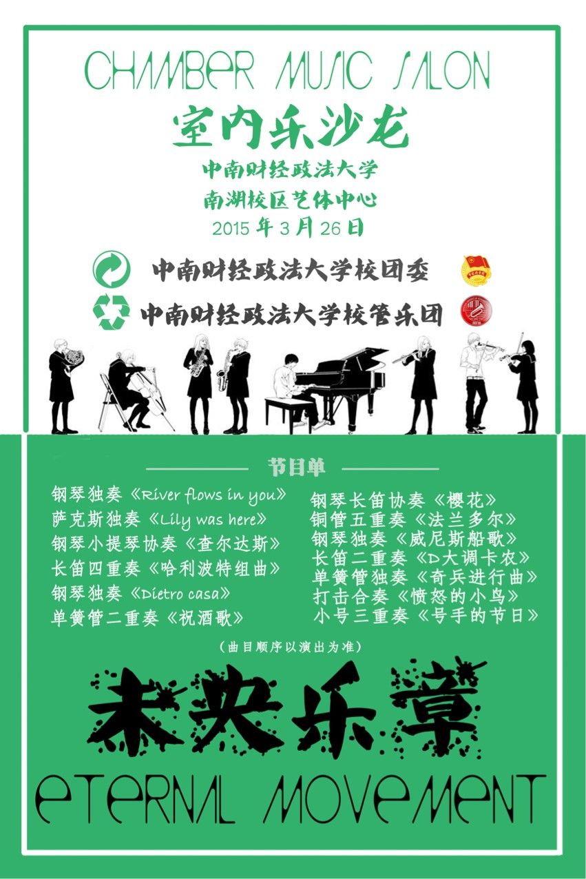 备注:我校学生凭校园一卡通免费入场。18:20开始入场,18:50停止入场。请同学们自觉保持音乐厅内整洁,严禁携带食品饮料入场,观看期间将手机关闭或调至静音,遵守场地管理规定。
