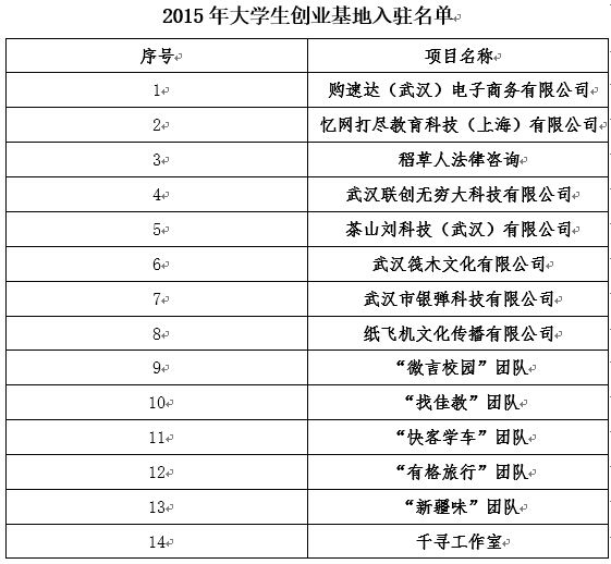 根据《米兰电竞·(中国区)大学生创业基地管理办法》的精神,经创业团队申报、创业学院初审、基地专家组评审和基地领导小组审议通过,确定购速达(武汉)电子商务有限公司等13个创业团队为2015年大学生创业孵化基地入驻创业团队。现予以公示: