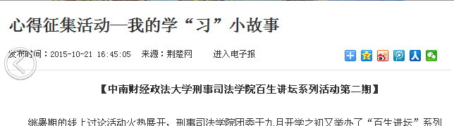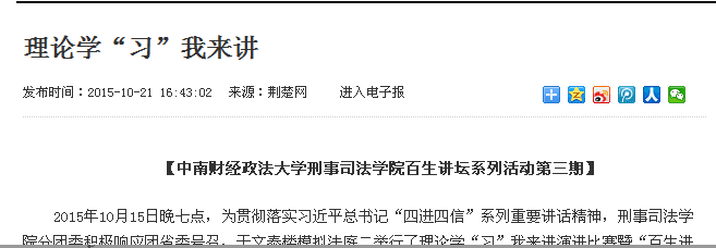 刑事司法学院团委开展的“百生讲坛”——大家一起来学“习”系列活动共分“主题团日:理论学‘习’动起来”、“心得征集:我的学‘习’小故事”、“演讲比赛:理论学‘习’我来讲”、“心得宣讲:理论学‘习’共分享”四个阶段。其中,“主题团日”和“心得征集”两个阶段被“荆楚网”分期进行专题报道,得到社会各界的广泛关注。同时,该分团委整理汇编了“心得宣讲——理论学‘习’共分享”活动中优秀作品,印制了“最优文集”和个人“最优心得”,并在全校范围内分发宣传,同时将电子版推送至学院官网、官方微信、微博供广大团学青年阅读学习。