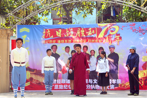 新闻与文化传播学院新闻1301团支部的同学们自发组成暑期社会实践团队,通过走访遗迹、自编导演话剧、走访老兵等多种创新形式,表达对抗战历史及抗战英烈的纪念与缅怀,团省委学校部部长徐本禹在恩施专程看望指导了该实践团队,省委常委、省委宣传部部长梁伟年专门就其中的话剧巡演作出“向这七名大学生致敬!要支持他们正能量的演出,要把校园文学艺术搞得更加红火起来”的批示。新闻与文化传播学院分团委将该实践团队主题话剧《不朽殊勋》系列成果编成纪念册,详细地介绍了团队成员对恩施抗战历史的所见所闻所感,并在全校范围内广泛传阅,话剧巡演的情况也被《湖北日报》、《人民日报》、《长江日报》、“荆楚网”等媒体广泛关注和报道。