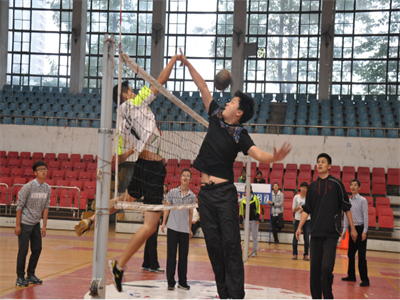 赛前,各位运动员都认真地做着热身运动,随着裁判员的一声哨响,比赛正式开始。在第一场男教师队对战男学生队的比赛中,男教师们各施绝技,一个个精彩发球,起跳,拦网,扣球,让在场的观众们都欢呼不已,男教师队在第一局便以32:30胜出男学生队,然而我们的学生也不甘示弱,在接下来的一局比赛中战胜教师队。最后一局两队开始进入白热化的竞争中,最终男教师队取得了最终的胜利。