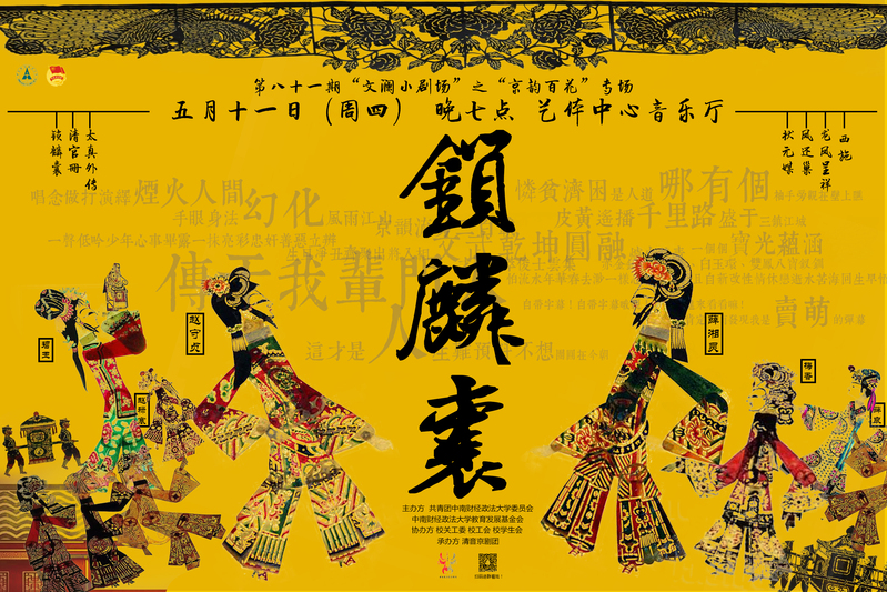 校园京剧专场晚会是我校大学生京剧团即清音京剧团的年度特色活动,旨在传承国粹艺术瑰宝,发展校园艺术文化,丰富广大师生的课余生活。自今年起,清音京剧团的京剧专场晚会正式定名为“清音乐府”。