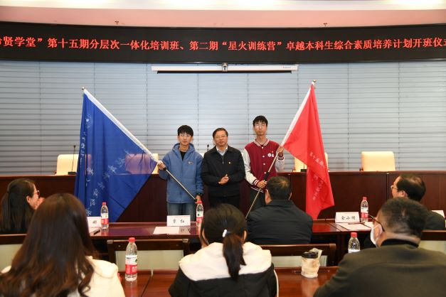 培训会上,覃红为“希贤学堂”第十五期青马班、第二期“星火训练营”授旗。