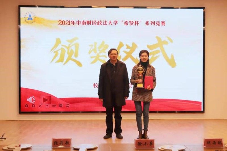 校团委书记梁娜、校学生会主席团成员余熙为“希贤杯”季军获得者公共管理学院颁奖