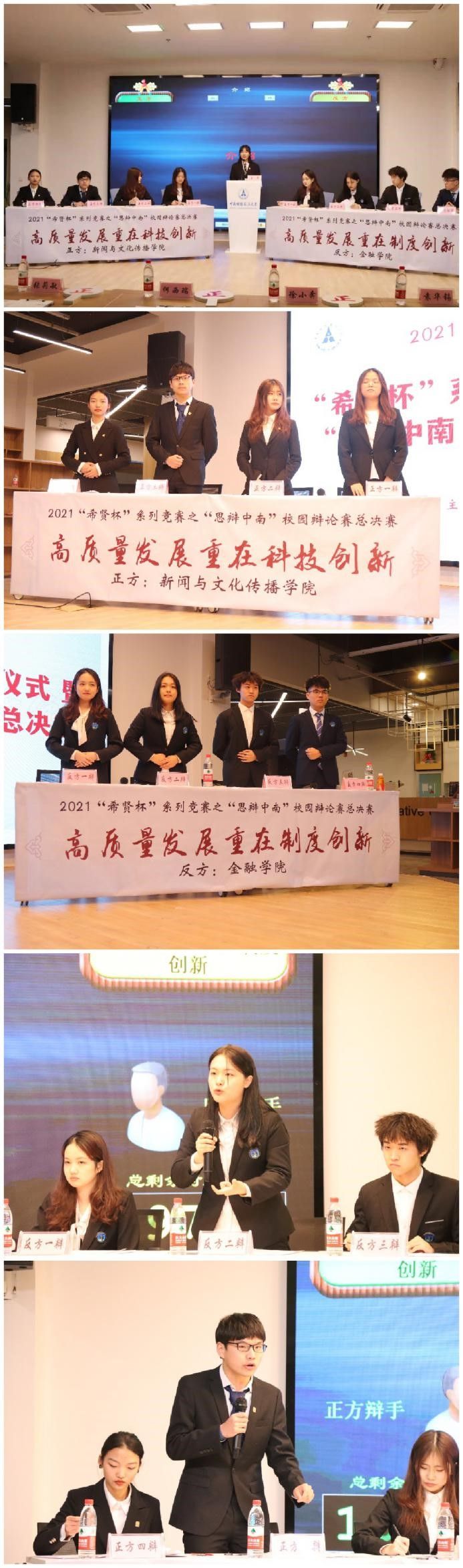 在活动第一阶段,“思辨中南”校园辩论赛总决赛中,新闻与文化传播学院和金融学院的辩手围绕“高质量发展重在科技创新/制度创新”展开了激烈的辩论。马克思主义学院副教授何西瑞,哲学院副教授张莉敏,校辩论队总教练、法学院副教授徐小奔,公共管理学院副教授贺三维,经济学院副教授袁华锡担任辩论赛总决赛评委。