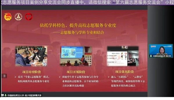 新闻网讯(通讯员 潘芳 学生记者 陈功 邓乔茵)第六届中国青年志愿服务项目大赛暨2022年志愿服务交流会于12月1日-4日通过线上顺利举办,我校作为特邀代表参加高校志愿服务分享交流会。校团委副书记杨少同代表我校做“依托学科特色 服务社区发展”主题经验分享。