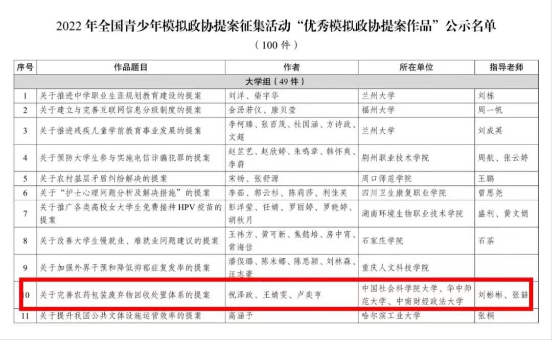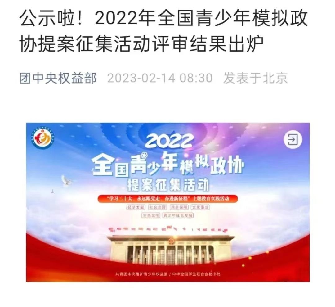 新闻网讯(学生通讯员 陈伊诺)2月14日,2022年全国青少年模拟政协提案征集活动评审结果正式出炉,我校提案作品《关于完善农药包装废弃物回收处置体系的提案》《关于推进传统农民向新型职业农民转型的提案》被评为“优秀模拟政协提案作品”。
