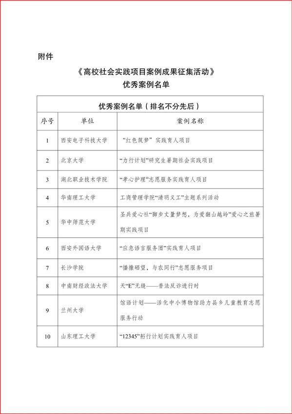 据悉,在中国青少年研究会面向全国高校发布了征集案例的通知后,各高校积极响应,共征集到了近300个案例。经过遴选,最终70个优秀案例成果入围。其中,由校团委主导申报的“读懂中国”系列社会实践项目和法学院团委书记钟开炜老师主持申报的“天‘E’无缝——普法反诈进行时”实践项目成功入选。