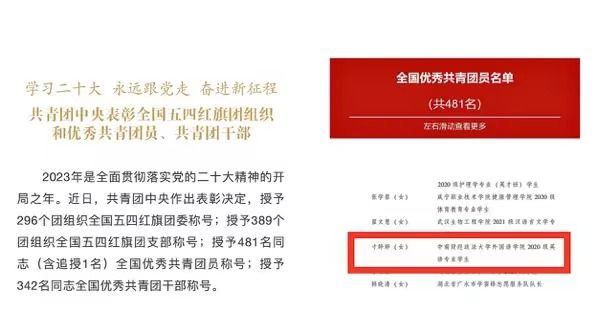 新闻网讯(通讯员 徐若冰)为充分发挥先进典型示范引领作用,激励广大团组织和团员、团干部踔厉奋发、创先争优,近日共青团中央作出表彰决定,我校本科生寸婷婷荣获2022年度“全国优秀共青团员”,成为我校首位获此殊荣的优秀共青团员。据悉,全国五四红旗团委(团支部)、全国优秀共青团员、全国优秀共青团干部是共青团中央设立的分别授予县级以下团委和基层团组织、团员、团干部的团内最高荣誉。