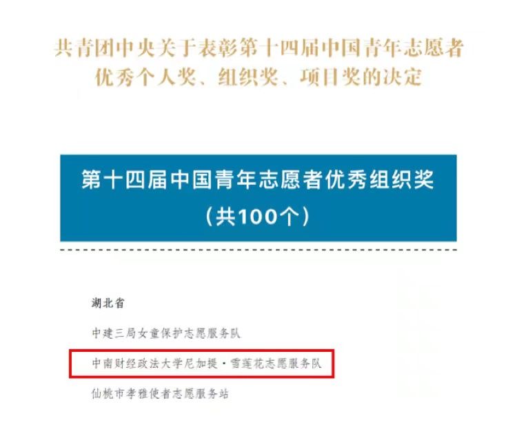 服务队先后荣获全国最佳志愿服务组织、湖北省学雷锋活动示范点、湖北省“本禹志愿服务队”示范团队等称号,承担中央五部委“全国大学生民汉双语志愿服务团(米兰电竞·(中国区))”建设任务。服务队项目多次荣获中国青年志愿服务项目大赛银奖、湖北青年志愿公益项目大赛金奖等荣誉,多次受到新华社、《人民日报》、《光明日报》等媒体报道。
