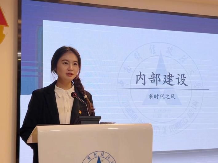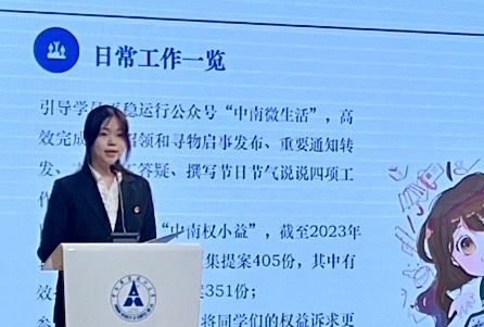 权益服务部负责人陈伊诺汇报了过去一年部门开展的多样化工作,不仅平稳运营“中南微生活”“中南权小益”公众号,增加了公众号的学生粘性,还开展了“美丽校园创建行动”“第五届模拟政协提案大赛”“‘文明寝室’和‘星级寝室’评选”等一系列活动,推进学生权益工作全面落实。