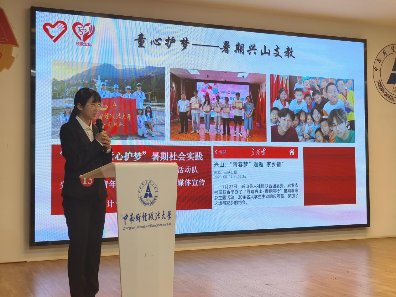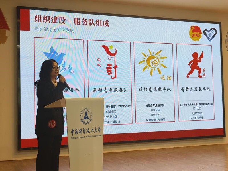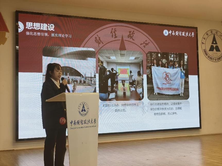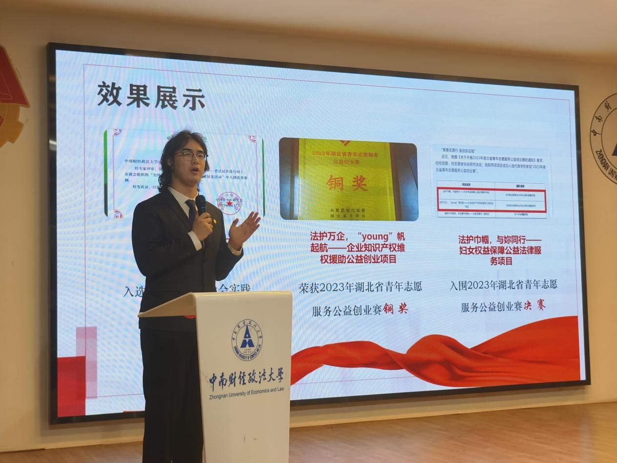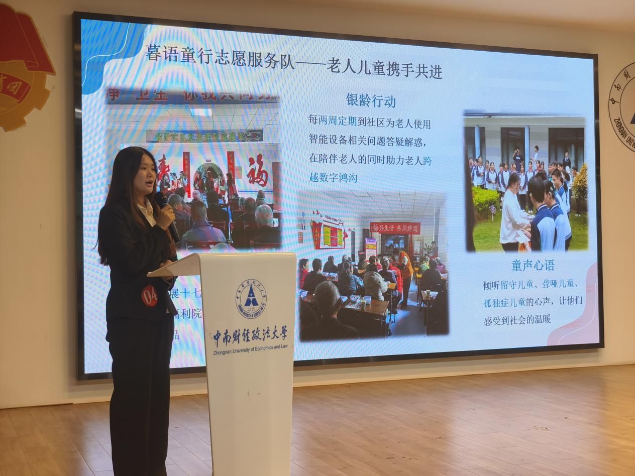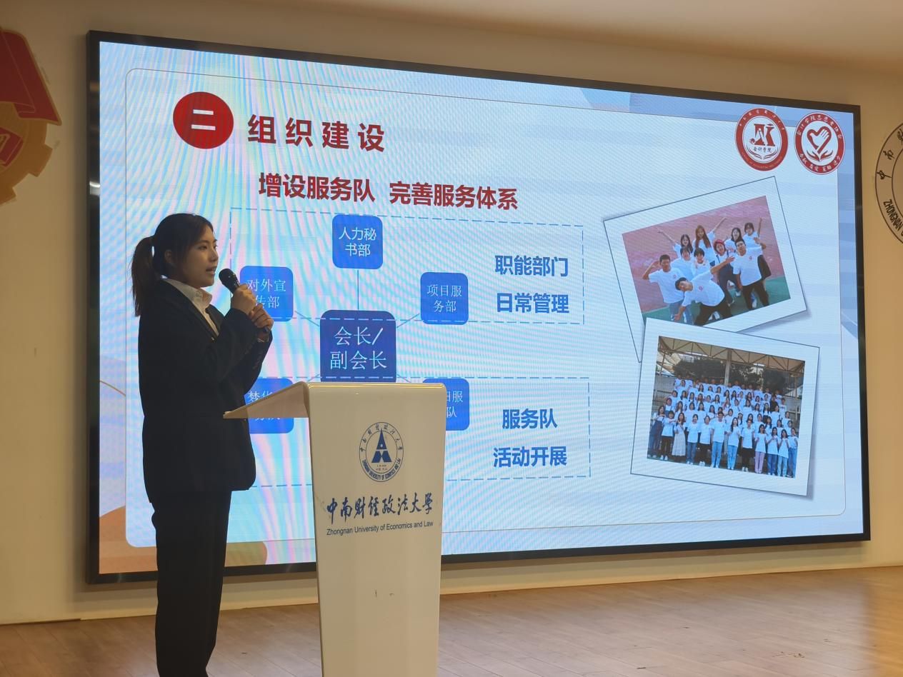 第二位进行答辩的是外国语学院志愿者协会的代表。他从思想建设、组织建设、日常工作、服务开展情况四个方面展开,重点讲解了刑事司法学院志愿者协会的“译路同行”支教活动和面向云贵地区开展的外语支教、普法宣传活动,利用专业知识创新志愿活动内容,助力西部教育事业发展,体现中南大外语人的社会担当。