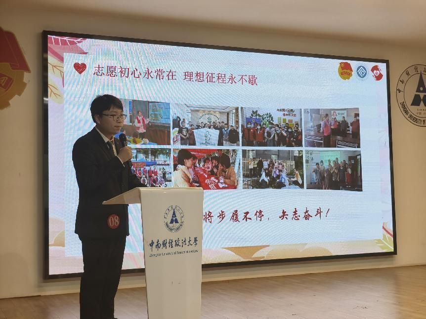 第一位进行答辩的是刑事司法学院志愿者协会的代表。他从活动创新、组织架构、制度体系等方面入手,讲解刑事司法学院志愿者协会在2023—2024学年的志愿成果,强调“志愿者协会首先是一个为青年志愿者着想的平台,然后才是一个服务他人的平台”,突出青年志愿者在志愿活动中的重要作用,致力于让中南大志愿红点亮更宽广的舞台。