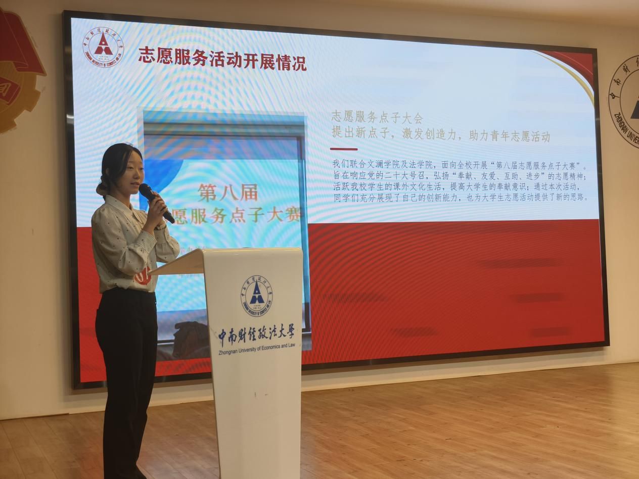 第六位进行答辩的是法学院志愿者协会的代表。他从加强思想建设、推进诚信建设与志愿服务制度化、成熟制度体系规范开展工作、一体多元内外互通、支援精品化品牌项目化等方面总结这一学年里法学院志愿者协会的志愿成果。法志协本持着“弘德尚法,躬行济世”的初心使命,相信志愿服务大有可为,也大有作为,用实际行动彰显法科学子的使命担当。