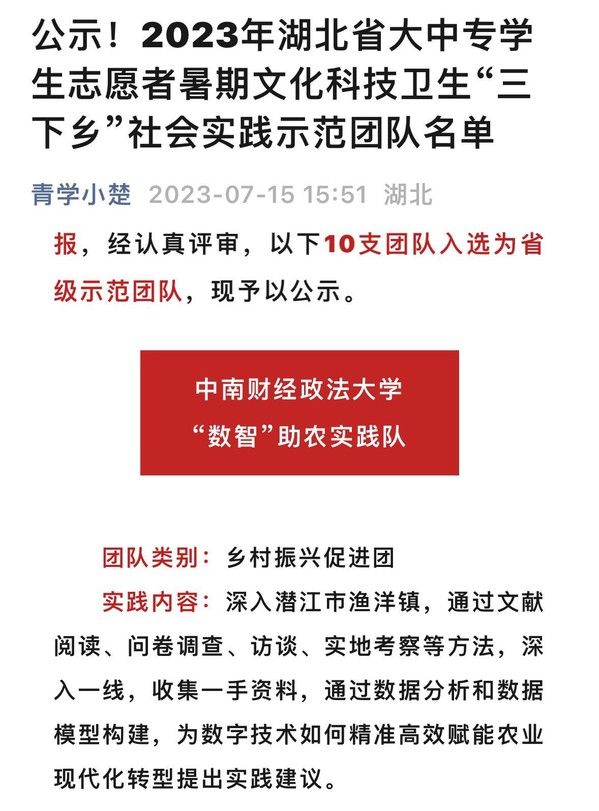 同时,支部以中国大地为课堂、以现实问题为素材,致力于发挥青年实干家精神,用专业所长反哺国家所需和未来所向。立足数字中国,支部“数智助农实践队”入选湖北省三下乡示范团队(全省仅十支),利用暑期奔赴潜江、随州等地深入调研,围绕数字经济创新与产业转型升级参与撰写的多篇提案被湖北省委组织部、发改委、经信厅等部门采纳批复,获评湖北省“三下乡社会实践优秀项目”。立足创新中国,支部成员创办“凯珀科技”助力电商惠农,推动了云南盐津300万只特色土鸡上云出栏,当地农户累计增收500余万元,赋能供应链上下游100余家小微企业发展壮大,相关事迹获“青春湖北”等媒体多次报道。