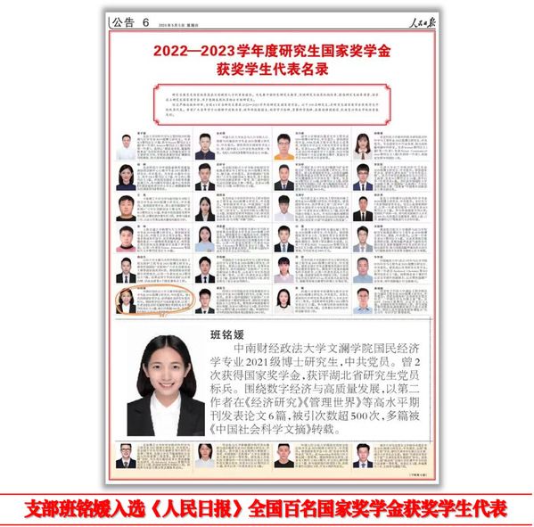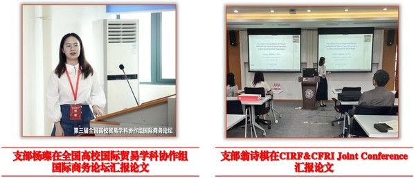 支部注重引领团员开展创新性学术研究,致力于把论文写在祖国大地。定期召开“学术沙龙”,聚焦中国数字经济、企业创新、产业升级等“中央关心、社会关注、人民关切”领域,分享前沿文献与研究进展,充分发挥本硕博一体化学术科研“传帮带”作用。同时,支部团员努力成长为“学术新星”,参与(主持)国社科基金重点项目、国自科基金面上项目、中央高校基本科研经费研究生科研创新平台项目等国家级、省部级课题10余项,在《经济研究》《China Economic Review》《Pacific-Basin Finance Journal》《Managerial and Decision Economics》等中英文重要学术期刊发表论文10余篇;2023年支部有10余人次在中国留美经济学年会、中国经济学年会、中国社会学年会、全国高校国际贸易学科协作组国际商务论坛、世界计量经济学会亚洲会议等国内外权威学术会议宣讲论文。支部团员刻苦钻研、锐意创新,在美国大学生数学建模竞赛、“互联网+”“挑战杯”等国内外权威学科竞赛中斩获国家级、省部级奖励20余项,每年均有团员获评学校各类学业奖学金。其中,支部团员班铭媛在《经济研究》《管理世界》等顶级期刊发表论文6篇,成功登选《人民日报》全国百名国家奖学金获奖学生代表,并获国家留基委资助赴加拿大联合培养。