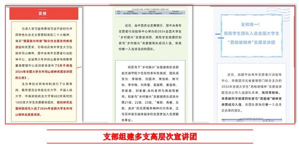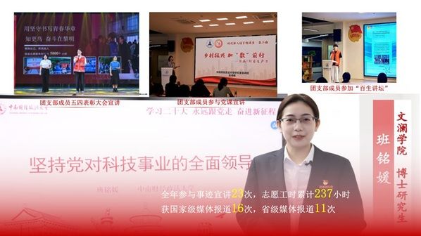 支部注重团员青年的思政引领和理想信念教育。组织开展“三进三联——红色党史知识竞赛”“院长书记同上一堂思政课”“红色校史知识竞赛”“红色教育基地研学”等内容丰富、形式多样的团日活动与主题团课;组建“全国大学生乡村振兴志愿宣讲团”“湖北省学习贯彻党的二十大精神师生基层宣讲团”“知更鸟志愿服务宣讲团”等多支高层次理论宣讲团,其中“知更鸟志愿服务宣讲团”成功入选“全国大学生井冈山精神志愿宣讲团”和“全国大学生西柏坡精神志愿宣讲团”,均为我校唯一入选团队;支部团员主讲的党的二十大精神宣讲课程被收录至《读懂中国·新时代铸魂育人大思政课》(全国示范项目),全年参与百生讲坛和党课宣讲等活动23次,宣讲服务工时累计237小时,获得国家级、省级媒体报道20余次。