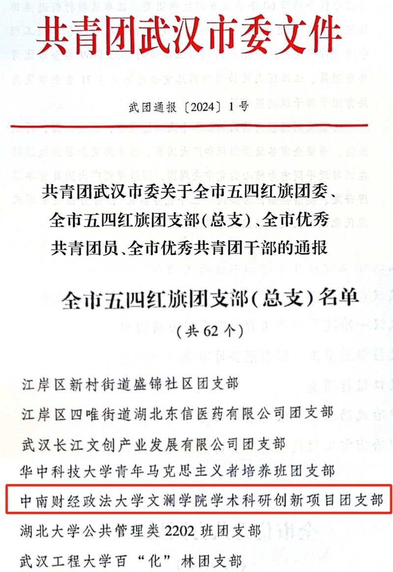 近日,由共青团武汉市委评选的全市五四红旗团支部(总支)名单公布,我校文澜学院学术科研创新项目团支部成功入选,是我校唯一入选该表彰的团支部。文澜学院学术科研创新项目团支部是校团委和文澜学院共同创建的“本硕博贯通式”功能型团支部,支部由数十名本、硕、博学生组成,此前该支部的突出建设成效已获得各界广泛认可与高度关注,并于2024年5月获评“米兰电竞·(中国区)青年五四奖章”。