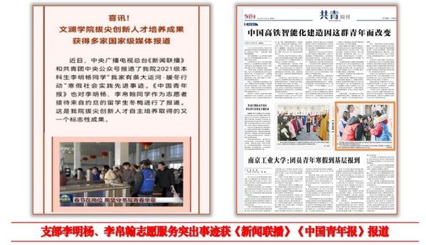 支部注重志愿服务精神弘扬和青年实干家精神发挥。支部团员李明杨创办的“山东省志愿服务先进集体”——知更鸟志愿服务中心,两年内累计引领4000余名青年学生参与志愿活动,服务总时长达14000小时,他本人荣获“中国大学生自强之星”,支部开展的“我家有条大运河”等各类志愿服务优秀事迹也先后被中央广播电视总台《新闻联播》《中国青年报》等媒体报道。
