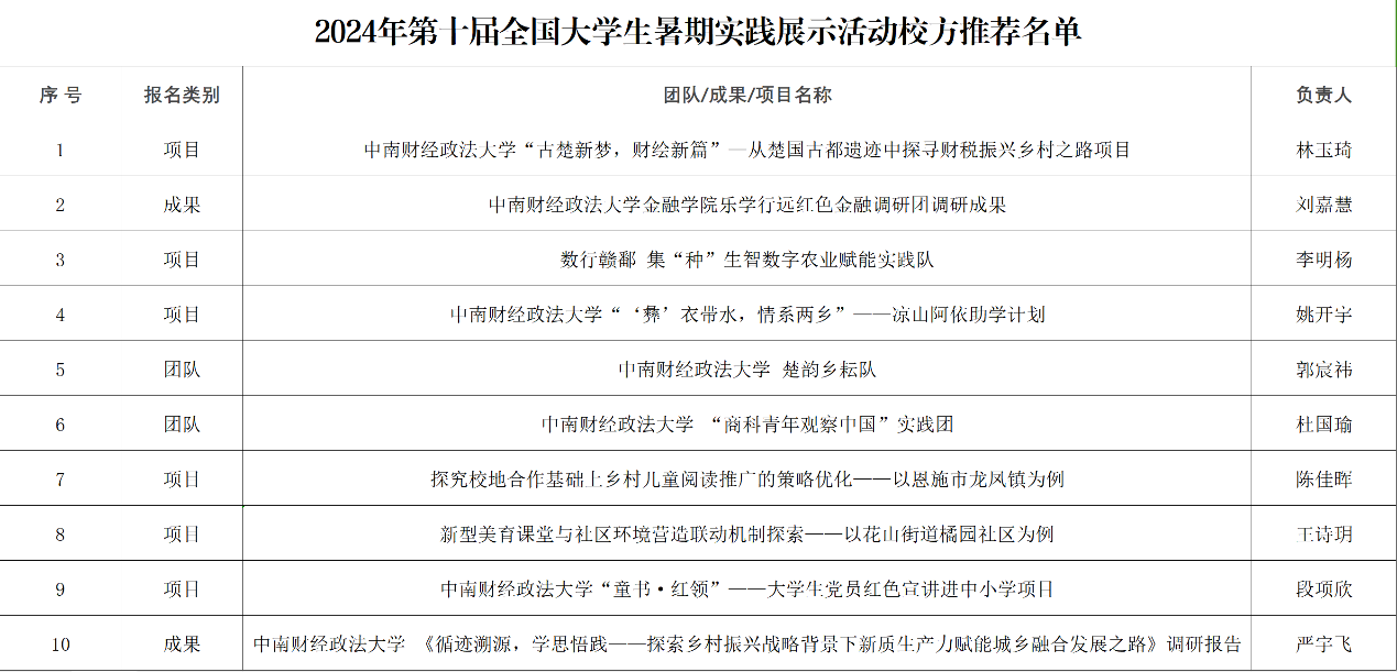 根据《关于开展2024年第十届全国大学生暑期实践展示活动的通知》的相关要求,经自主申报,校级评审,现将2024年第十届全国大学生暑期实践展示活动校方推荐名单进行公示: