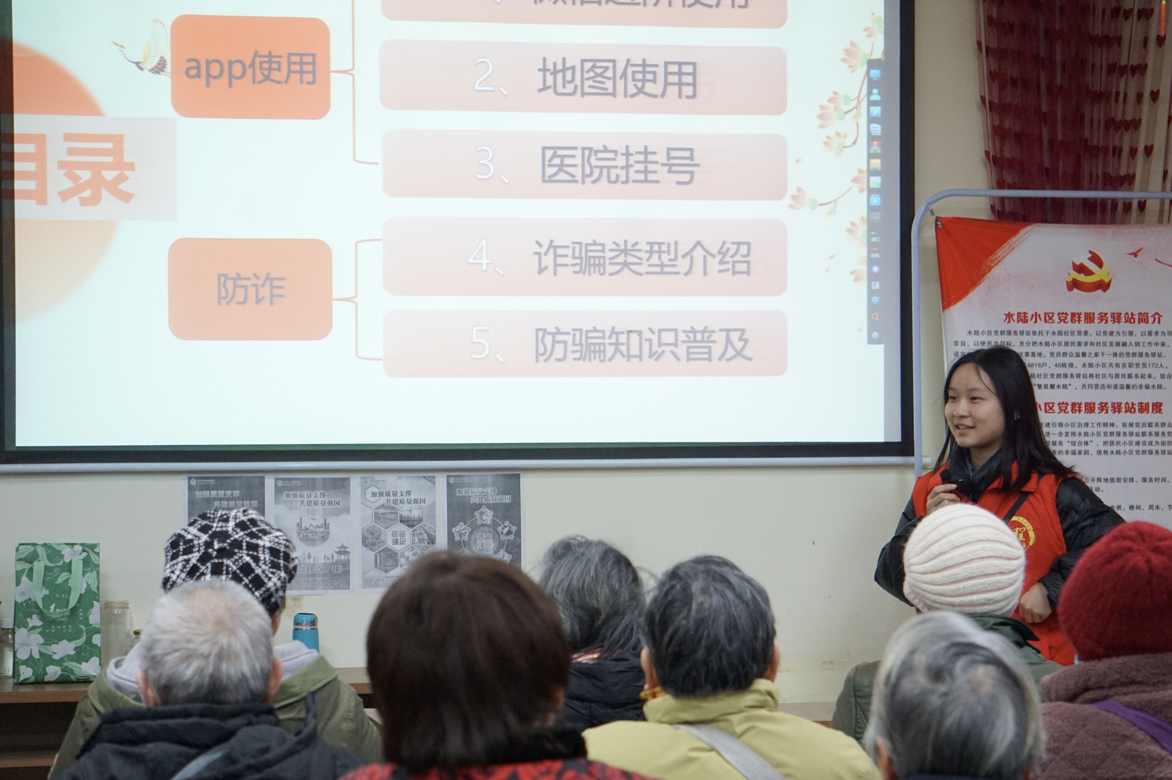 新闻网讯(学生通讯员 龙富浪)为助力老年人顺利融入数字时代,提高他们对智能设备的操作水平,并强化他们的防骗警觉性,我校信息工程学院青年志愿者们于12月12日下午前往水陆社区开展了“智汇晚年,识诈防骗”为主题的志愿服务活动。