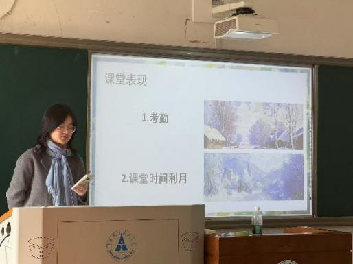 学习委员陈嘉懿用表格展示了上学期各科班级前三,加权平均分、平均学分绩点在班级前五的同学的成绩,以及与部分班级对比的班级进入年级前200人数、挂科人数,并通过与考勤和课堂时间利用比对分析,指出在课堂时间利用方面,存在着会因查看手机信息而错过老师讲的一些知识点等问题。针对这些她提出三点建议:注重平时的积累工作,提高课堂效率;合理的规划时间,为期末复习留出充足时间;对于已经制定好的计划要严格执行。同时她建议同学们可以用Forest、番茄钟等APP来控制手机的使用。