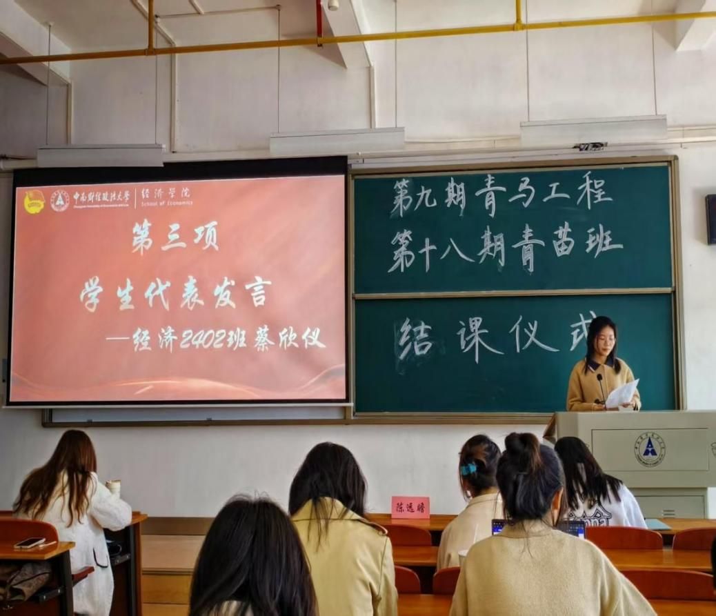 优秀学员代表经济2302班郭钰同学、经法2301马瑞晗同学、经济2402蔡欣仪同学依次上台发言,分享自己在青马工程中的所学所感所悟。从理论学习到实践锻炼,从思想升华到责任担当——展现了青马学员积极向上的精神风貌和追求卓越的坚定信念。学员代表的发言引发在场学员的强烈共鸣,现场掌声雷动。