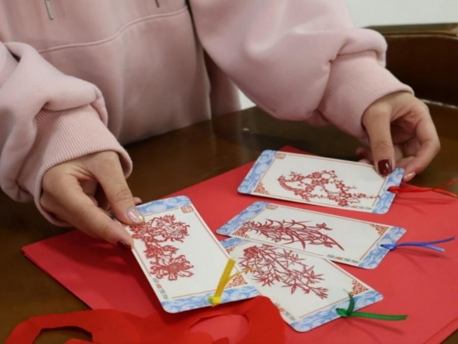 随后,同学们将理论与实践相结合,把火红的纸折成对称形状,用铅笔勾勒出花鸟鱼虫,红纸翻飞如蝶,剪刀游走似笔。“咔嚓咔嚓”声此起彼伏,笨拙的线条逐渐灵动,一个个精巧的剪纸作品完成了。空气中氤氲着纸香,同学们触摸的不仅是非遗技艺的温度,更是中华美学的灵魂,传统和现代在这一刻完美交融。