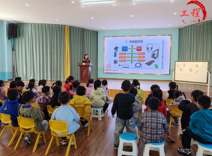 活动以“小小程序员”热场游戏拉开帷幕,孩子们通过执行“抬头/低头”“左转/右转”等基础指令,初步感知编程的指令逻辑。而后志愿者通过PPT演示与可视化信息结合,用生活场景类比解释二进制运算、CPU等运行逻辑,让抽象概念具象化。