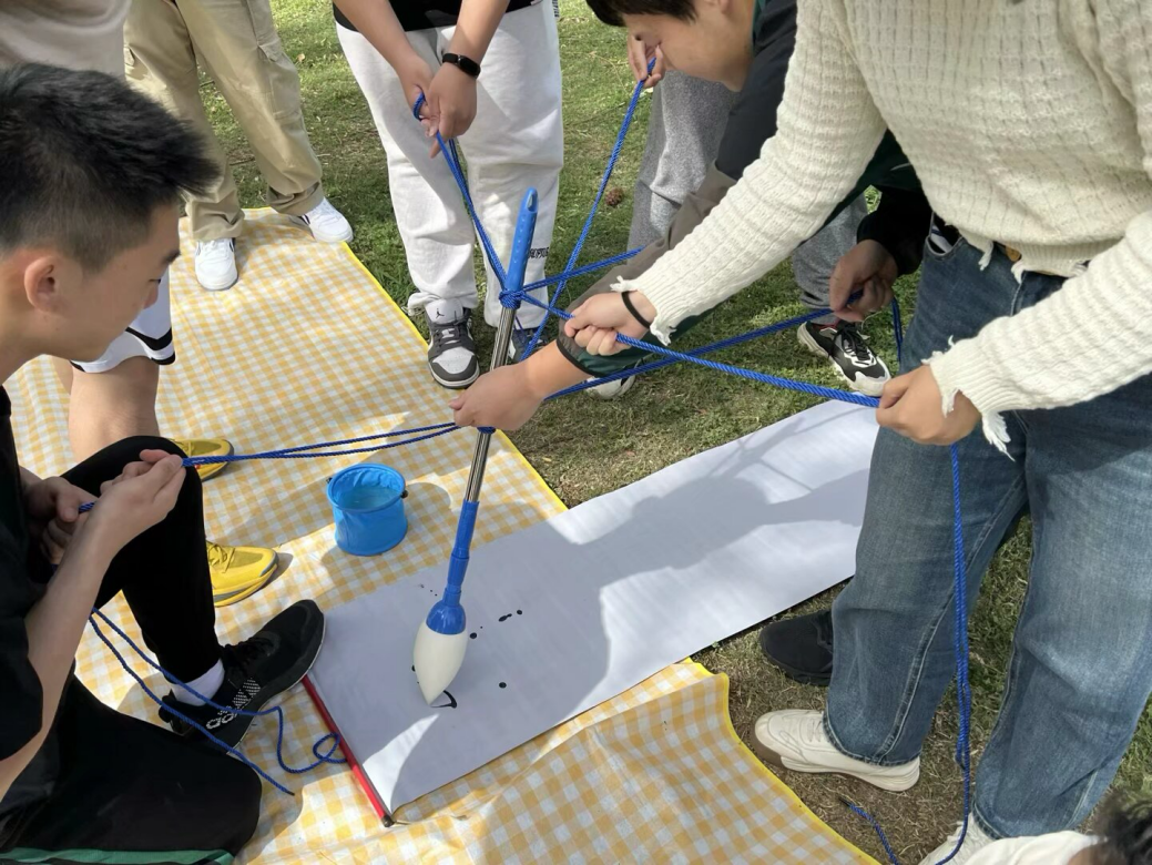 活动当天,同学们在班长付从炎同学以及其他班委的带领下齐聚南湖湖畔,在班长简单分享“世界地球日”的来历后,团日活动正式开始。首先进行的是趣味绘画环节,即众人通过合作绘画来勾勒出心中所想的生态风景。特制的画笔被蓝色绳索牢牢系住,几位同学各自握住绳索一端,齐心协力控制着画笔的走向。在洁白的画布上,大家仿佛化身为环保小卫士,共同挥舞着毛笔来描绘着心中的绿色图景。同学们分别画出了森林、河流等自然风景。每一笔都饱含着同学们对生态文明的美好憧憬,也坚定了守护生态环境的信念。
