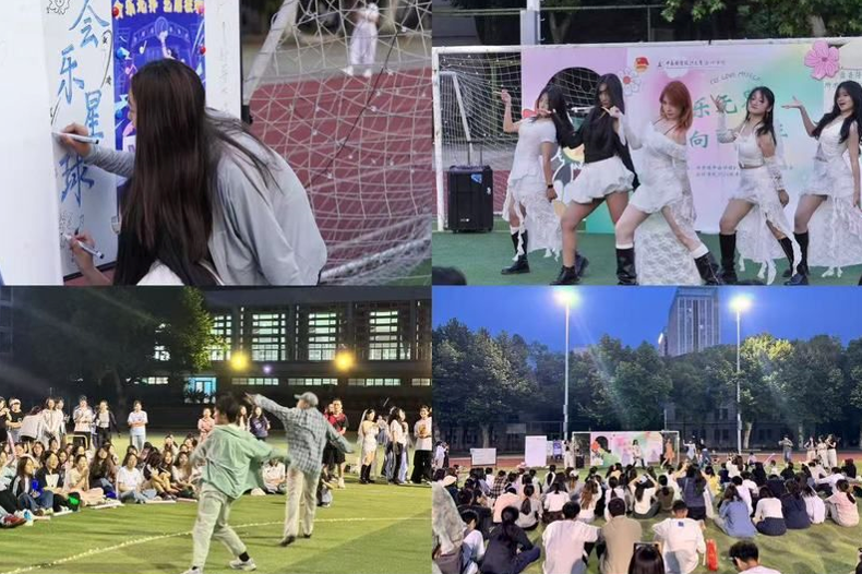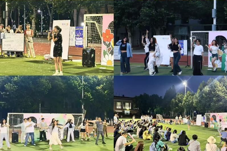 夜幕降临时,“‘会’乐无界,‘艺’启狂欢” 草地音乐节在南操场璀璨启幕,诠释了新时代青年蓬勃的艺术创造力与昂扬奋进的精神气象。活动以活力四射的“随舞”派对点燃全场热情,文艺比拼环节中,《天下》《猫步轻俏》等表演轮番上阵,妙语连珠的脱口秀表演引发阵阵欢笑。特别设置的彩蛋环节里,24级本科生辅导员赵达骋、孙紫微同年级团总支全体成员惊喜呈现创意编排的《养生操》,以诙谐动感的韵律将现场氛围推向顶点,为整场活动画下欢乐的注脚。