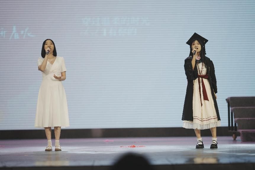 校主持人工作室的穆翌斐、朱成秀等同学带来的朗诵《琵琶行》深情而富有感染力;张孝鹏带来的说唱《危险派对》节奏明快,充满活力,展现了年轻人的朝气和对自由的追求;橘园社区小朋友带来的歌曲《童年》和《青春修炼手册》唤起了大家对青春岁月的美好回忆,他们的纯真童声与毕业生们的青春记忆交织在一起,让在场的每一个人都仿佛回到了那段无忧无虑的时光。