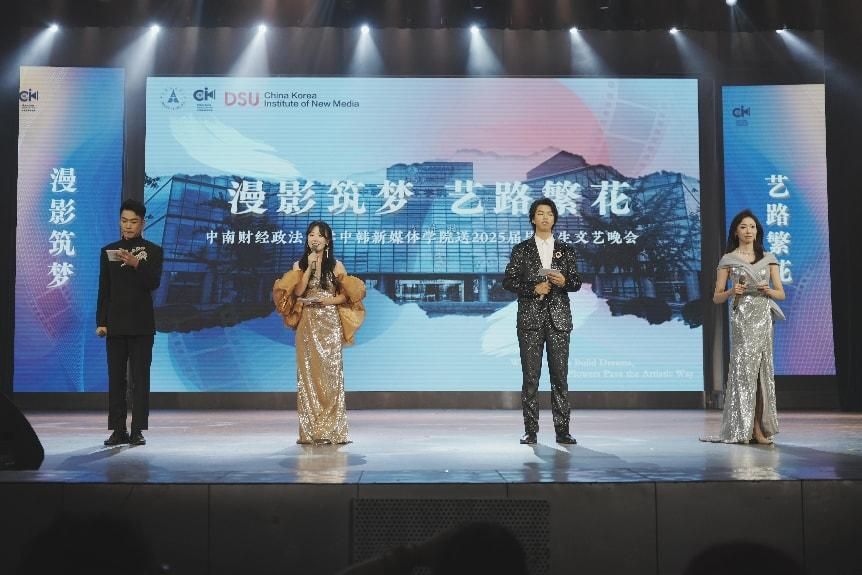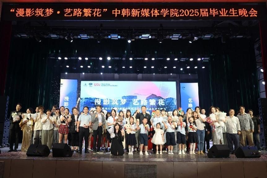 新闻网讯(学生通讯员 赵子墨)5月23日晚七点,“漫影筑梦,艺路繁花”中韩新媒体学院2025届毕业生晚会在南湖会堂盛大举行。中韩新媒体学院党委书记于方、韩方院长金荣奇、副院长(主持行政工作)赵博雅、韩方副院长朴弘植以及中韩双方部分教师代表和毕业生们共同到场观看晚会。