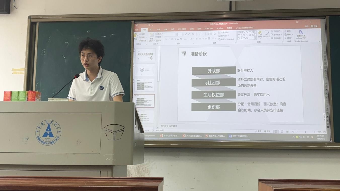 紧接着,冯宸祎对团学组织招新事宜进行整体安排与说明,明确各部门招新任务分配,提醒招新注意事项。