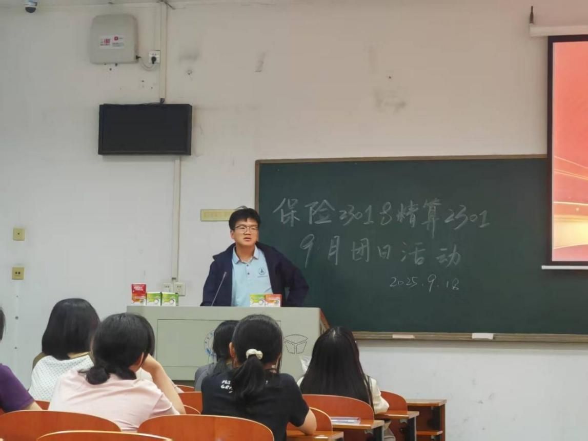 在随后环节中,金融学院辅导员江永鑫老师应邀出席保险2301与精算2301团支部团日活动,并作了开场讲话。江老师结合习近平总书记关于抗日战争重要论述,阐释了伟大抗战精神的内涵与时代价值。他强调,青年一代要铭记历史,珍惜和平,勇担重任。
