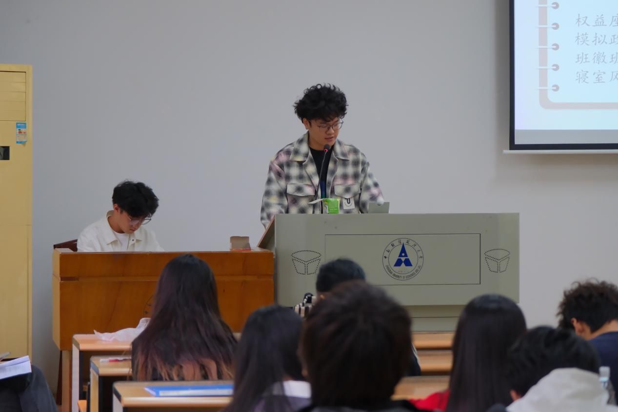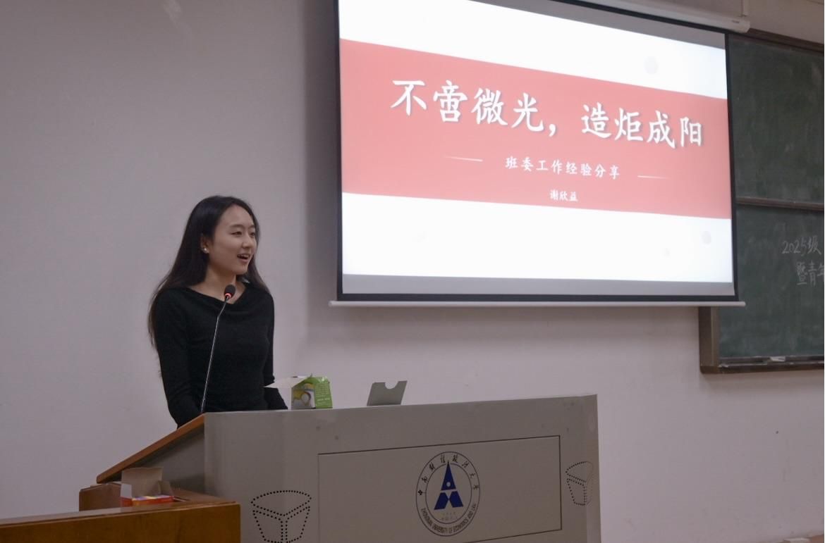 优秀班干部代表讲话。金融2302班最美团支书谢欣益从自身经验出发,围绕心理建设、内部协作以及集体力量等多方面提出衷心的建议。