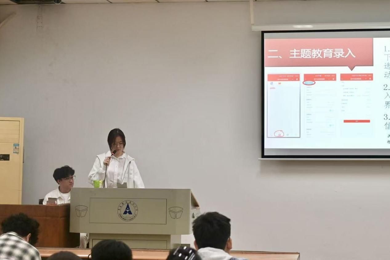 接着,分团委各部门逐一对基层团支部工作展开介绍与指导。办公室主任杨晨佳就团日活动的形式、内容与工作流程展开系统培训。在他的悉心指导下,各班团干部对活动的前期策划与后期评分总结等环节有了更充分的认识。调研培训部部长邵晴从各个环节详细地介绍了社会实践与教室借用流程,为各团支部相关活动的开展奠定基础。组织联络部部长姜郁婷对智慧团建和二课系统的操作流程展开指导。新闻部部长姬鸿飞通过丰富的案例与简练的语言,清晰地说明了新闻稿写作与团日活动宣传材料的相关规范与要求。