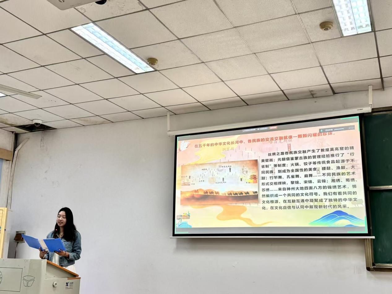 接着,学生会主席团成员李燕琴进行团课领学。中国各民族是血脉相融、骨肉相连的,是和谐相处、守望相助的。各学员要扎根中国历史根基,秉持“天下大同”的共同信念,牢记并践行平等团结互助和谐的价值理念,展现新时代中南大人团结互助的美丽风采。