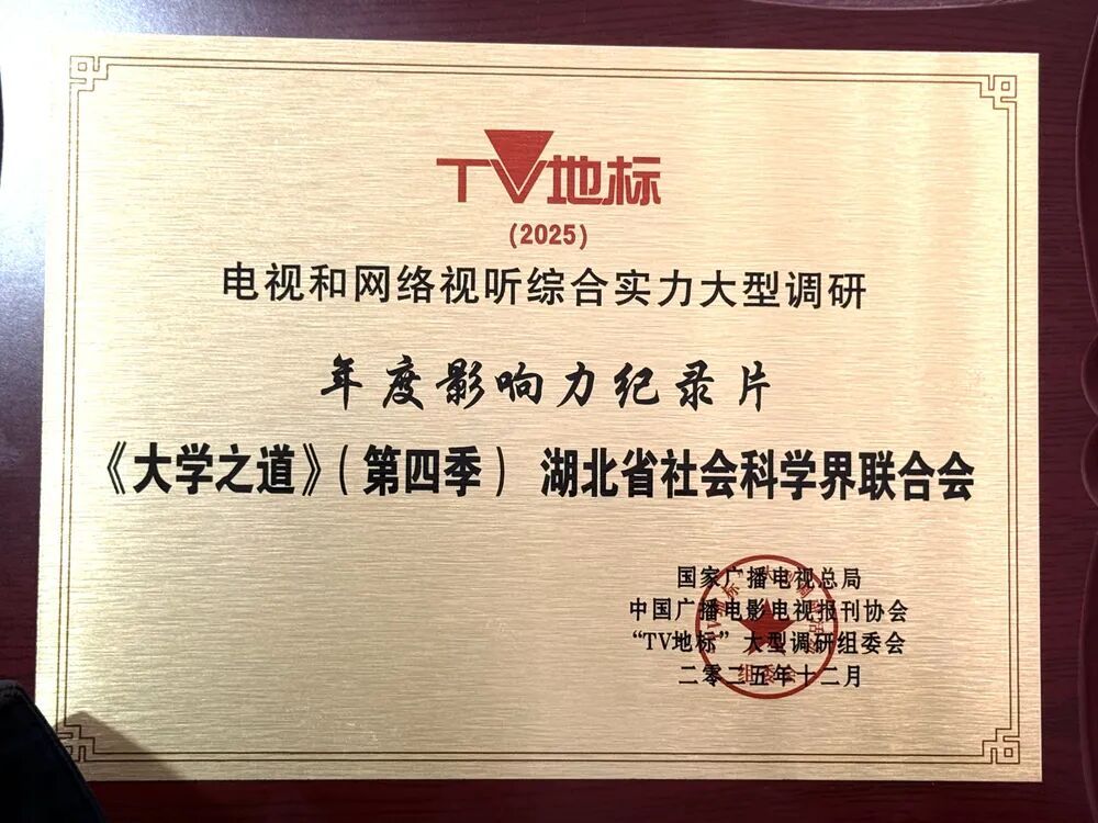 近日,在北京举行的“TV地标(2025)”大型调研成果发布会上,国家广播电视总局中国广播影视报刊协会“TV地标”大型调研组委会,为湖北省社会科学界联合会牵头打造的国内首档大学生立德成长纪实节目《大学之道》第四季等9部作品颁发重量级奖项——“年度影响力纪录片奖”。