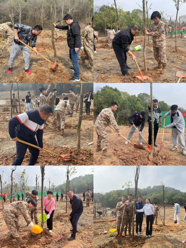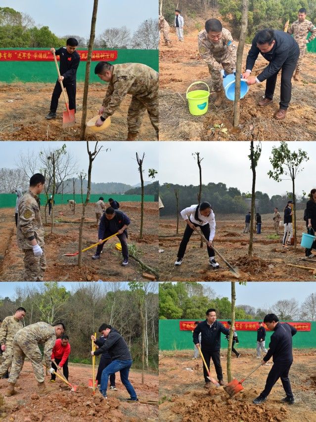 参观结束,官兵们、老师们一起拿起铁锹、提起水桶,来到植树点种树。从挥锹挖坑到扶苗填土再到踩实浇灌,大家分工协作、密切配合,不怕苦、不怕累,种下了一棵棵有“精神”的树,充分促进了军民互动、增进了军民团结。