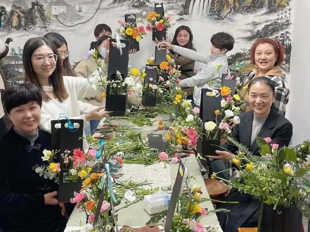 活动现场花香四溢,气氛热烈轻松。花艺师就插花艺术历史、插花容器、插花技巧与配色意境等作了详细讲解与演示。