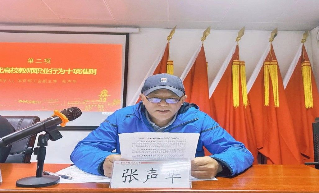 体育部教代会主任张声华领学《新时代高校教师职业行为十项准则》。他指出,《准则》明确了新时代高校教师职业规范,并针对主要问题、突出问题划定了基本底线。我们应认真学习、深刻领悟,自觉做以德立身、以德立学、以德施教、以德育德的楷模,维护教师职业形象,提振师道尊严。