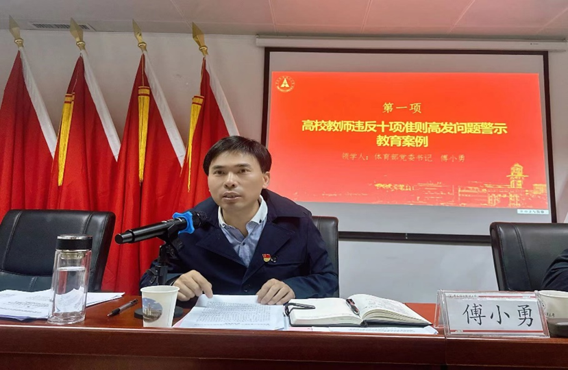 傅小勇领学《教育部公开曝光第十二批7起违反教师职业行为十项准则典型案例》、《高校教师违反十项准则高发问题警示教育案例》,并对案例进行了详细分析和针对性解读。他强调,全体教师要以案为戒,做到警钟长鸣。一要提高政治站位,紧绷师德思想弦,严守师德红线;二要注重常态化学习,切实提升思想政治和师德师风学习实效;三要守好教学主阵地,将高尚师德、良好师风贯穿于体育教育工作全过程。体育教师既要精通专业知识、做好‘经师’,又要涵养德行、成为‘人师’,把为学、为事、为人统一起来,才能更好地践行“为党育强人、为国育全才”使命,助力培养德智体美劳全面发展的社会主义建设者和接班人。