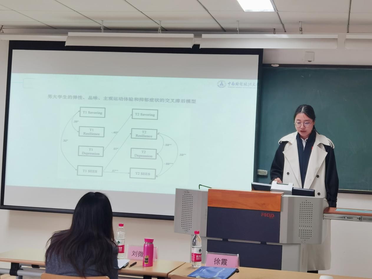 李晶琳以《体质弱势大学生心理弹性、品味当下、主观锻炼体验和抑郁之间的交叉滞后关系研究》为题,详细介绍了体质弱势大学生心理问题的研究背景及问题现状,并对自身的研究成果进行了重点分享,为进一步分析探讨相关问题提供了新思路。