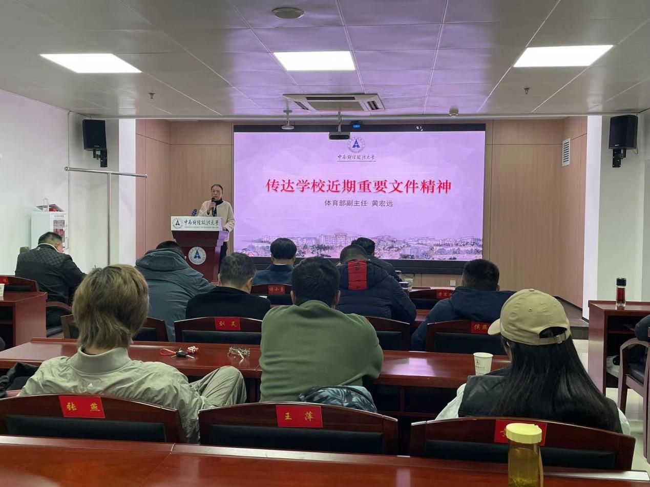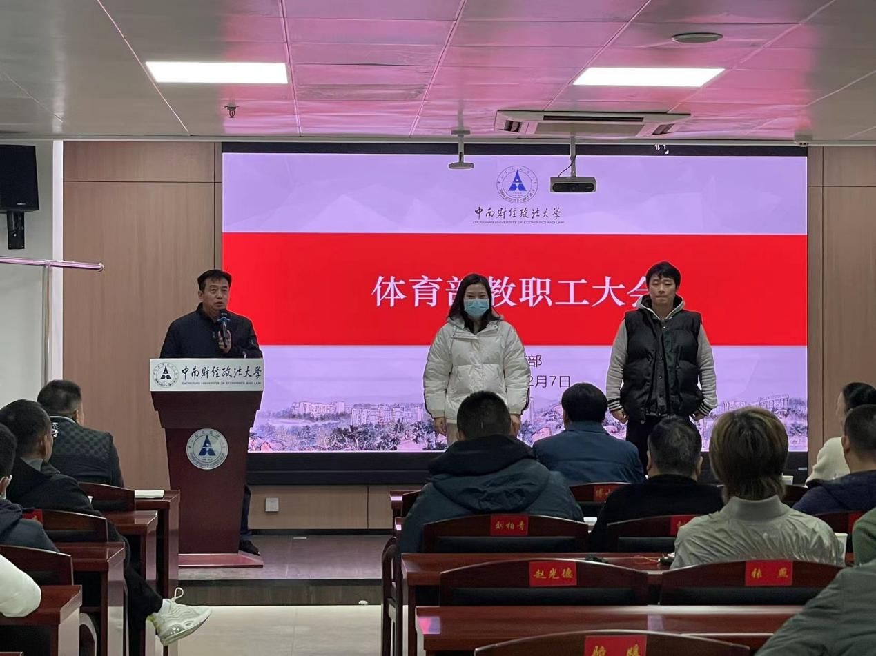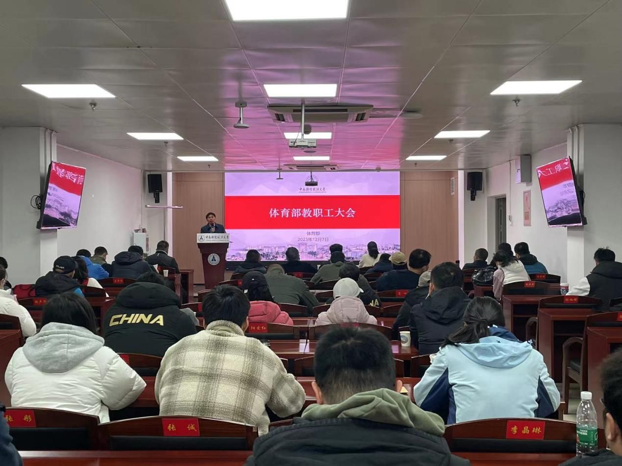 新闻网讯(通讯员 姚亚杰 学生通讯员 刘畅 李晓慧)12月7日,体育部在艺体中心A113大会议室召开全体教职工大会,传达学习学校近期重要文件精神,安排部署期末教学重点工作。会议由体育部党委书记傅小勇主持,全体教职工参加。