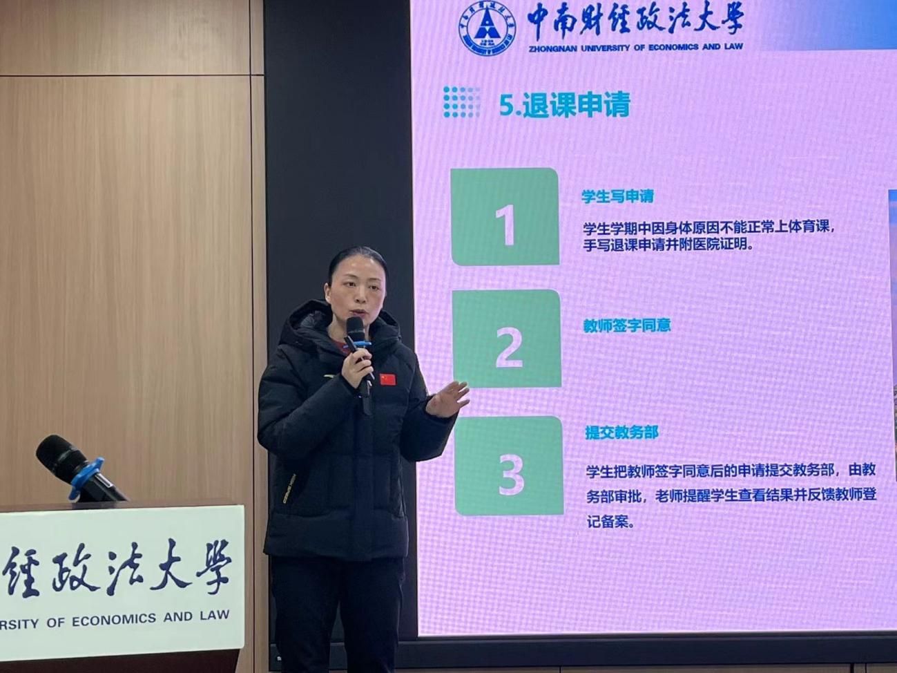 体育部副主任黄宏远就新学期教学工作发言。她从补考、缓考、成绩复查等方面对教学相关制度进行详细解释说明,并重点强调了优化教学大纲、新开通识课申报、加强课堂管理等期初教学注意事项。
